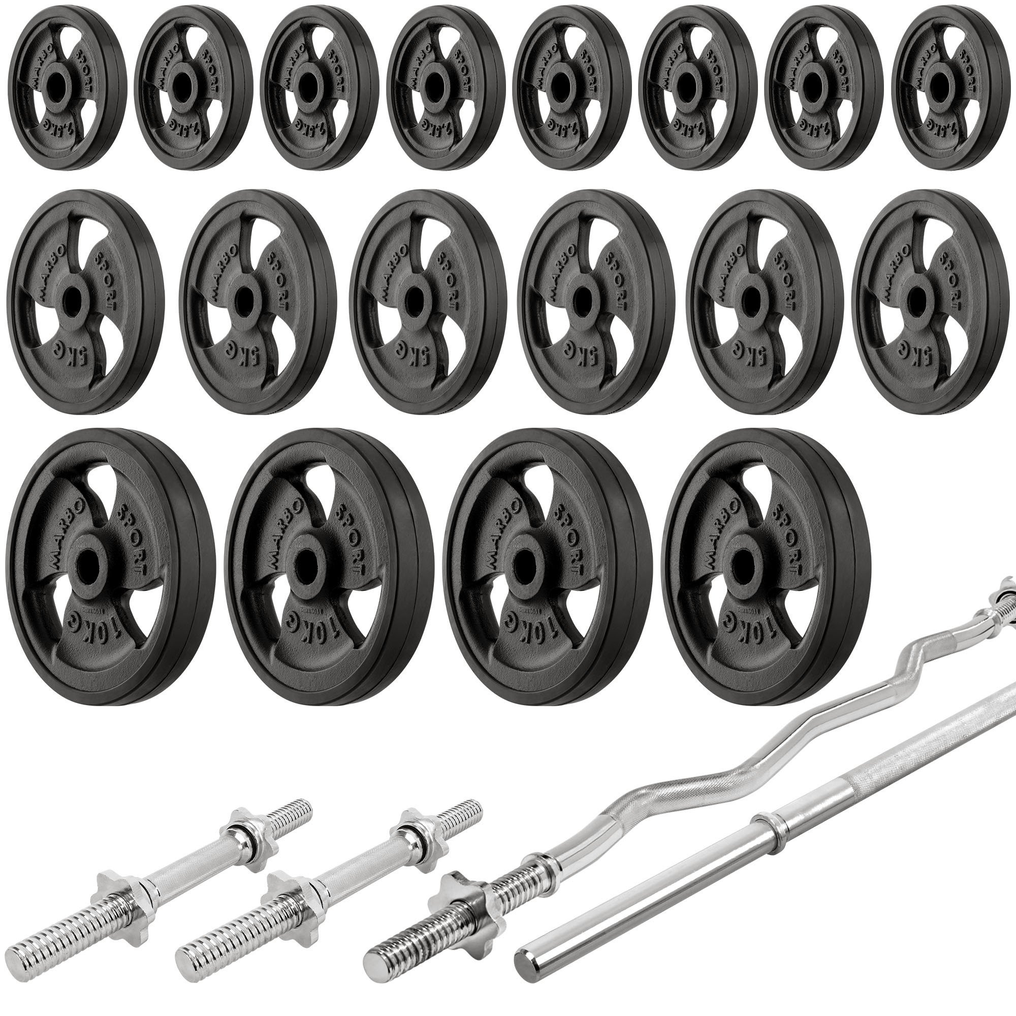 A megerősített rudak és gumírozott súlyok készlete mindent tartalmaz a hatékony edzéshez.